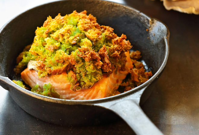3. Die Lachsstücke nun mit den Pilzen belegen. Anschließend alles gleichmäßig mit der Bröselmasse bedecken. Im Ofen auf der mittleren Schiene 15-20 Min. garen.
