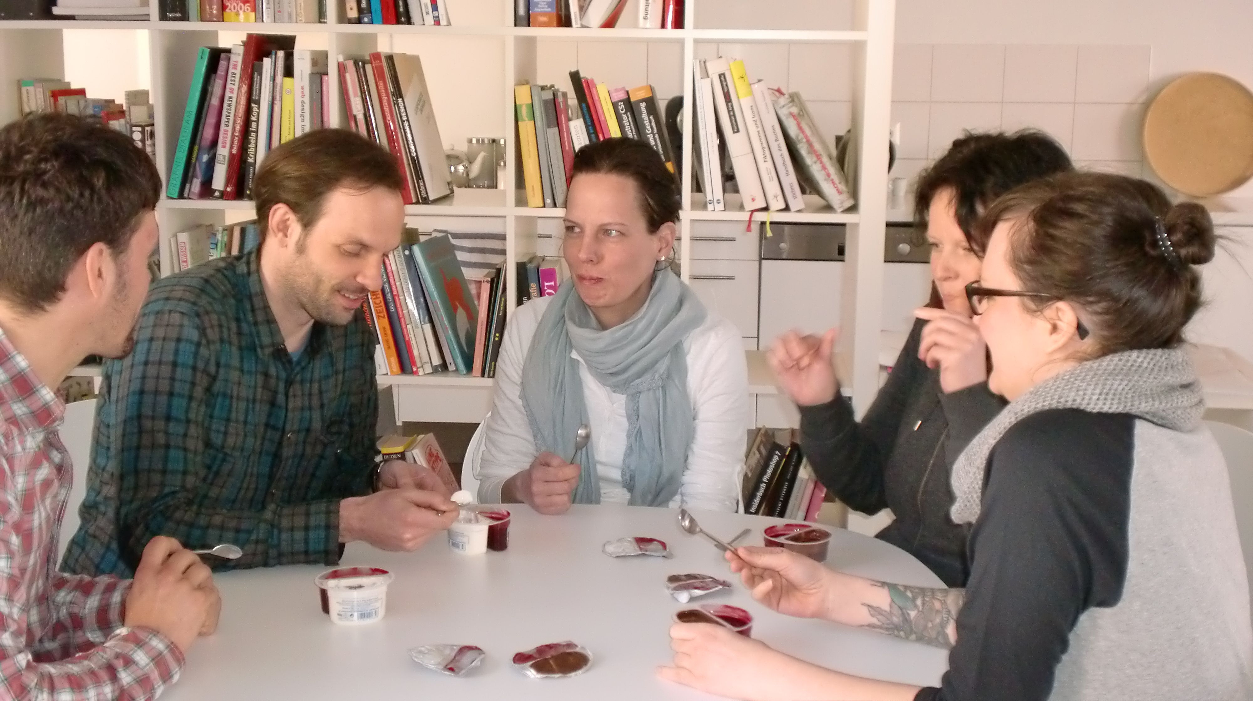 Bei unserem wöchentlichen Meeting im Büro stand Kirsch-Grütze von Dr. Oetker auf dem Speiseplan.  Auch einige Kollegen aus den benachbarten Büros waren spontan mit am Start und bewappnet mit Löffeln und großem Appetit ging es ans Verkosten.