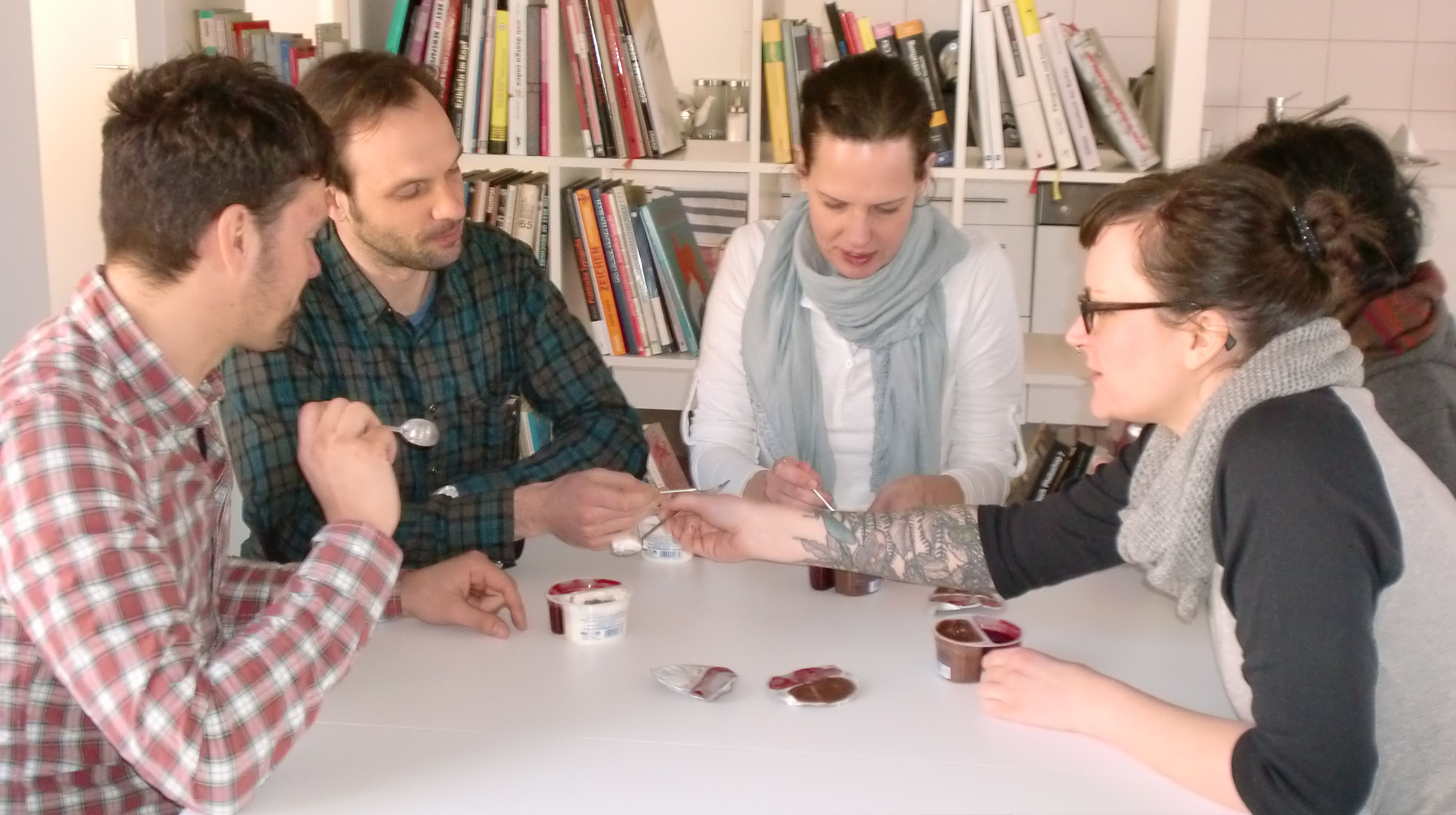 Als es schließlich ans Probieren ging, wurden bereits nach kurzer Zeit die ersten Meinungen laut. Der Großteil unserer netten Runde entpuppte sich rasch als Liebhaber der leckeren Joghurtcreme, obwohl die süße und sehr schokoladige Creme ebenfalls einige Fans auf ihre Seite brachte.
