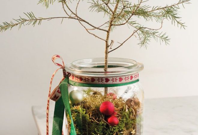 3. Das Glas zur Hälfte mit Moos auffüllen und andrücken, so erhält die Fichte Halt.