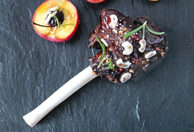 Dammhirschhaxe mit Bratäpfeln, Backpflaumen, Rosmarin & Mandeln