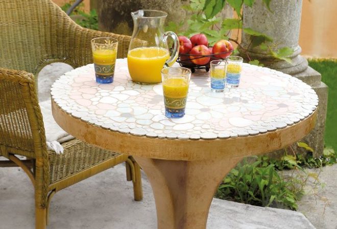 4. Das Mosaik auf traditionelle Art legen. Für den abgebildeten Tisch wurde eine Bordüre aus japanischem Mosaik gelegt, der Rest wurde mit abgerundeten Fliesen belegt.