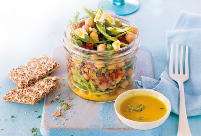 2. Für die Vinaigrette Raps- Kernöl, Essig, Honig, Senf und Kräuter verrühren und mit Salz und Pfeffer würzen. Vinaigrette mit Linsen, Kichererbsen, Tomaten und Rucola vermischen und den Salat auf Tellern oder in dekorativen Gläsern