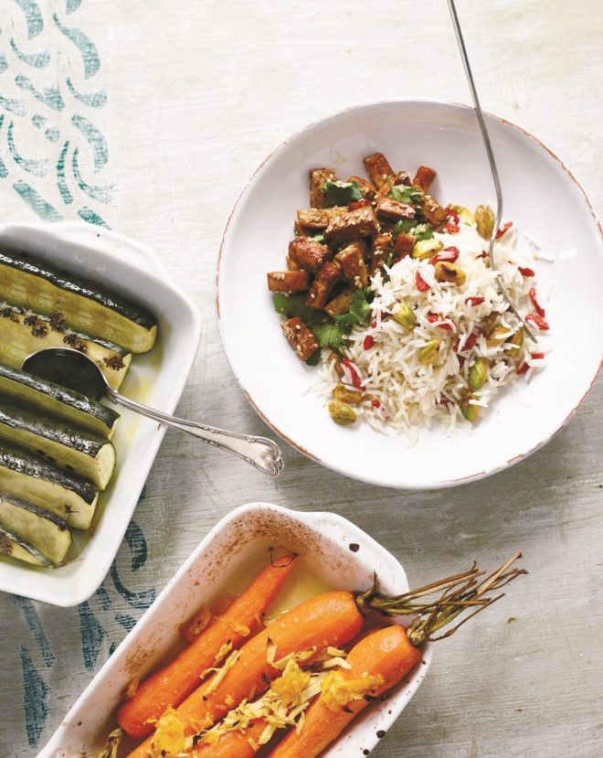Pistazien-Goji-Reis mit Tofu und Ingwer-Karotten