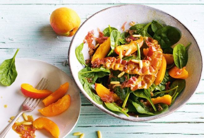 1. Den Spinat waschen, verlesen und gut abtropfen lassen. Aprikosen waschen, halbieren, den Stein herauslösen und die Hälften in feine Spalten schneiden. Den Spinat auf einem Teller anrichten, die Aprikosen darauf verteilen.