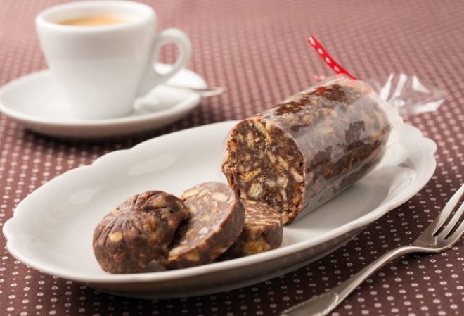 3. Masse mit den Walnuss-Keks-Bröseln mischen. In drei Portionen teilen. Jede Portion zur „Wurst“ formen, in Frischhaltefolie wickeln, fest eindrehen und etwa 2 Stunden kühlen. In dicke Scheiben schneiden und genießen.