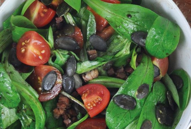 Feldsalat mit Serrano-Schinken und Croûtons Zutaten für 4 Portionen frischer Felsalat 12 Kirschtomaten 4 Scheiben Weißbrot 4 Scheiben Serrano-Schinken Butter Granatapfelessig Salz, weißer Pfeffer Honig Sonnenblumenöl Balsamicocreme 1. Die Kirschtomaten… Weiterlesen