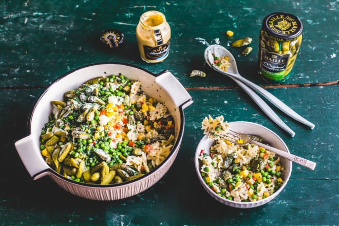 Mit dem mittelscharfen Senf von Maille lassen sich viele köstliche Gerichte aufpeppen und verfeinern. So auch der saftige Nudelsalat, den wir euch gerne vorstellen möchten.