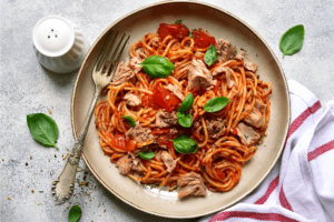 Köstliche italienische Pasta mit leckerem Fisch in einer fruchtigen Tomatensoße. Die Basis des Gerichts bilden die langen Spaghetti, die mit einer einfachen Soße aus Tomaten, Thunfisch, Zwiebeln und Knoblauch zubereitet werden. Wir empfehlen das Gericht mit Oliven und frischem Basilikum und Parmesankäse zu verfeinern, um den Geschmack abzurunden. Solltest du kein Oliven-Fan sein, schmeckt es aber auch ohne ganz wunderbar.