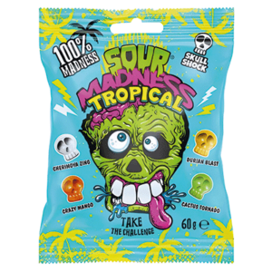 Erlebe einen exotischen Geschmack mit einem sauren Kick – Sour Madness Tropical vereint fruchtige Aromen wie Mango, Ananas und Passionsfrucht mit einer spritzigen, sauren Note. Diese aufregende Süßigkeit ist perfekt für alle, die es fruchtig und intensiv mögen. Jeder Bissen versetzt dich in ein tropisches Abenteuer!