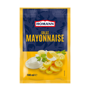 HOMANN Salat-Mayonnaise ist die Nr. 1 für Salate, Pommes und Snacks, im Imbiss und auch zuhause. Genieße ihren köstlichen Geschmack pur, für Dips und auf Snacks. Du bekommst sie in 3 Größen: 100 ml, 250 ml und 500 ml. Praktisch: der neue 100-ml-Beutel mit Perforation für ganz einfache Portionierung.