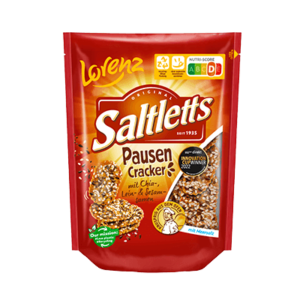 Der knusprig gebackene Vollkorn-Snack mit Chia-, Lein- und Sesamsamen ist ideal für den kleinen Hunger zwischendurch, egal ob im Büro oder unterwegs. Die Cracker sind reich an Ballaststoffen und kommen ganz ohne Geschmackverstärker aus. Einfach lecker, jederzeit und überall – ob pur, belegt oder zum Dippen.