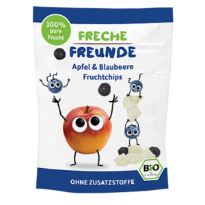 Alfred Apfel & Bibi Blaubeere haben 100% Bio-Fruchtchips gezaubert. Ohne Zusätze und gefriergetrocknet statt frittiert, macht snacken jetzt noch mehr Spaß! Die knackigen Apfel- und Blaubeerfruchtchips sind ideal für fruchtige Pausen und dank der Wiederverschließbarkeit perfekt für unterwegs!