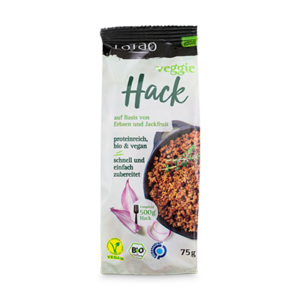 Erlebe die Freiheit veganen Hackfleisches mit  dem Veggie Hack. Die perfekte vegane Alternative mit 70 % Eiweiß. Ohne Farbstoffe oder Konservierungsmittel bietet es trotzdem langanhaltende Frische. Erbsenprotein und Jackfruitmehl sorgen für die ideale Textur und Bissfestigkeit. Perfekt für Chili sin Carne, Lasagne, Bolognese, gefüllte Paprika und vieles mehr. Einfache Zubereitung: 50 g Hack mit 250 ml kochendem Wasser/Gemüsebrühe übergießen, 2 Min. quellen lassen, abtropfen, auspressen, wie Hack verarbeiten.