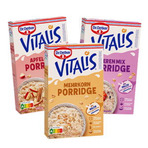Porridge kommt groß raus! Die Familienpackung bietet mit 3 Sorten leckere Vielfalt – ohne zugesetzte Aromen, mit dezenter Süße aus Agave und NutriScore A. Ob als klassisches Porridge oder als Overnight Oats – Vitalis Porridge sorgt für leckeren Genuss für die ganze Familie.