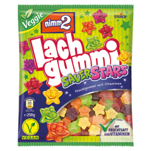 Die nimm2 Lachgummi SauerStars stehen für den veganen Naschspaß und laden ein, gemeinsam nach den Sternen zu greifen. Mit jeder Menge Sauer-Power überzeugen sie in 6 fruchtigen Geschmacksrichtungen: Zitrone, Granatapfel, Limette, Kirsche, Brombeere & Blutorange.