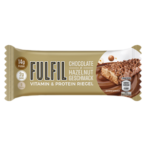Der FULFIL Proteinriegel mit Chocolate & Hazelnut Geschmack ist mit Milchschokolade überzogen und mit knusprigen gerösteten Haselnuss-Stückchen getoppt. Mit 14 g Protein, 1,1 g Zucker und 9 Vitaminen und 149 Kalorien pro 40 g Riegel ist er der perfekte Protein-Kick für zwischendurch.