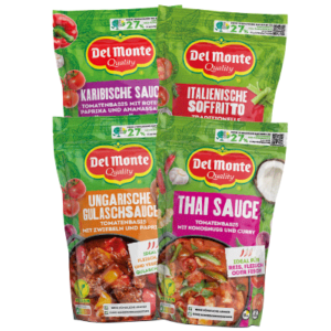 Seit über 135 Jahren steht Del Monte® für hochwertige Tomaten. Jetzt gibt es fertig zubereitete Saucen nach traditionellen Rezepten: ungarische Gulasch-Sauce, milde Thai-Sauce, italienische Soffritto und süß-scharfe karibische Sauce. Ideal für schnelle, raffinierte Mahlzeiten – im praktischen 250g-Beutel mit 27 % geringerem CO₂-Fußabdruck gegenüber Glas. Genuss für Gaumen und Umwelt!