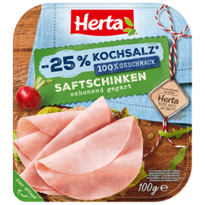 Weniger Salz, 100 % Geschmack – Bei Herta liegen bewusster Genuss und herzhafter Schinkengeschmack nah beieinander. Der Herta Saftschinken -25% Kochsalz enthält weniger Salz als herkömmlicher Kochschinken, was dem Geschmack allerdings keinen Abbruch tut. Der perfekte Begleiter für deine nächste Brotzeit.