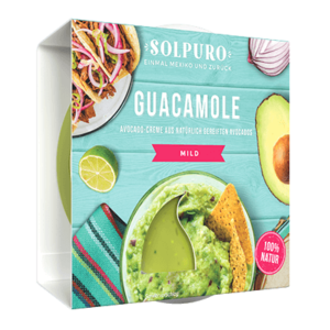 Die milde Guacamole von Solpuro ist mit ihrer Original mexikanischen Rezeptur aus Zwiebeln, Knoblauch etwas Jalapeño & Limettensaft auf dem Markt einzigartig in ihrer Qualität. Sie kommt ohne Antioxidationsmittel oder Zusätze aus und unterstützt neben ihrer Klimaneutralität auch Aufforstung-Projekte in Mexiko. Mit weniger Fuego als die klassische Guacamole von Solpuro schmeckt sie zu allen Gerichten.