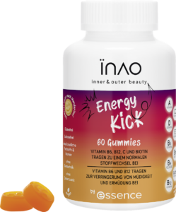 Die veganen Energy Kick Gummies von INAO by essence enthalten keine Stimulanzien wie z.B. Koffein, sondern vereinen mehrere natürliche Energie-Booster: Vitamin-Komplex kombiniert in leckeren Gummies in Form eines Smileys mit Mandarinen-Geschmack.