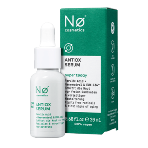 Das Antiox Serum von Nø Cosmetics enthält einen Antioxidantien-Cocktail, der deine Haut effektiv vor freien Radikalen und somit auch vor vorzeitiger Hautalterung schützt. Ferulasäure neutralisiert freie Radikale und kann Entzündungen sowie Rötungen mildern. Resveratrol schützt vor vorzeitiger Hautalterung und mindert oxidativen Stress.
