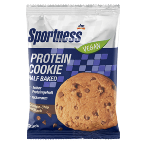 Der Sportness Protein Cookie half baked mit leckerem Chocolate-Chip Geschmack ist ein idealer Snack für zwischendurch, denn er ist vegan, zuckerarm und dazu noch reich an Protein. Proteine tragen zum Wachstum und Erhalt von Muskelmasse sowie zum Erhalt normaler Knochen bei.
