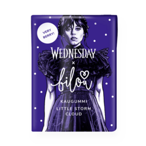 Wednesday x bilou Kaugummi. Little Storm Cloud – schmeckt beerig fruchtig nach saftigen Brombeeren – Zeit für mich – This is my writing time! Zuckerfreier Kaugummi mit Süßungsmitteln und Brombeer-Geschmack. Vegan, frei von Aspartam.