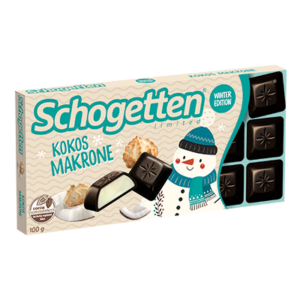 Die Winterstückchen: Schogetten Kokos Makrone – eine Kokosfüllung mit Kokosmakronen-Stückchen in einer verführerischen Zartbitterschokolade. Entdecke weitere Sorten des praktischen Tafelschokoladen-Klassikers unter www.schogetten.de und folge den leckeren Schokoladenstückchen auf Facebook und Instagram.