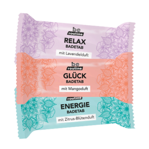 Gönn dir eine Auszeit mit den be routine Bade- tabs! Ob entspannender Lavendel, belebende Mango oder erfrischende Zitrusblüte – die drei Sorten RELAX, GLÜCK und ENERGIE verwandeln dein Bad in eine duftende Wohlfühloase und schenken dir genau den Moment, den du gerade brauchst.