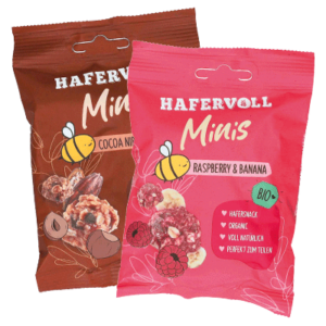 Die HAFERVOLL Minis Cocoa Nib & Hazelnut und Raspberry & Banana sind dein perfekter Snack on the go – ob im Auto, in der Uni, im Büro oder am Spielplatz zum Teilen mit den Kids. Sie kommen mit einer sehr kurzen und cleanen Zutatenliste um