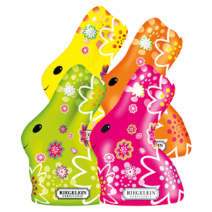 Die 4 farbenfrohen Sitzhasen in der Riegelein „Flower Line Range“ bieten einen unwiderstehlichen Genuss und dürfen zu keinem Osterfest fehlen. Zartschmelzende, feine Vollmilch- schokolade trifft auf florales Design. Ideal für‘s Osternest oder als kleine Überraschung zum Osterfest!