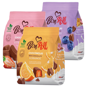 Bon Roll Choconolas Milchschokolade – drei fruchtige Genussmomente! Fruch- tiges Gelee mit echtem Fruchtpüree, umhüllt von zarter Milchschokolade – in den Varianten Erdbeere, Blaubeere und Orange. Vegetarisch und perfekt zum Naschen, Teilen oder Genießen. Jetzt entdecken und verlieben!