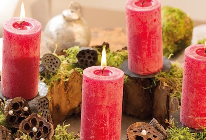 3. Das Moos zwischen den Rindenkreisen auf den Kranz legen. Die Kerzenhalter anbringen und die Kerzen aufstecken.